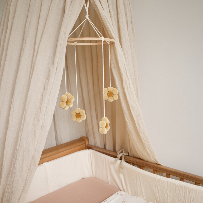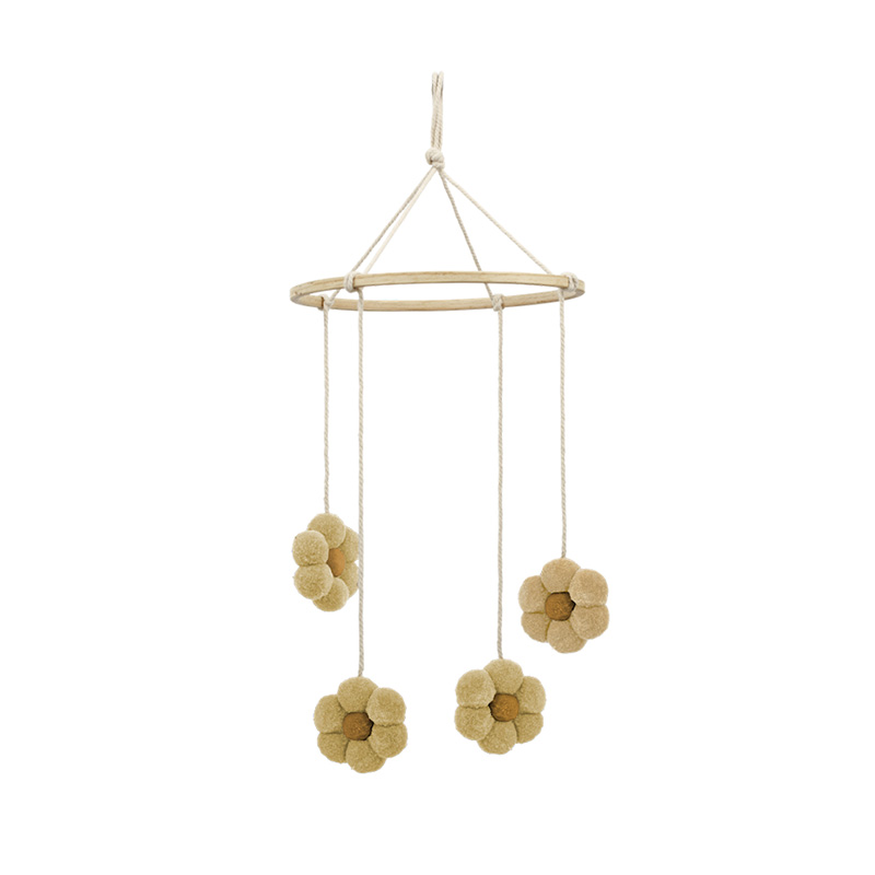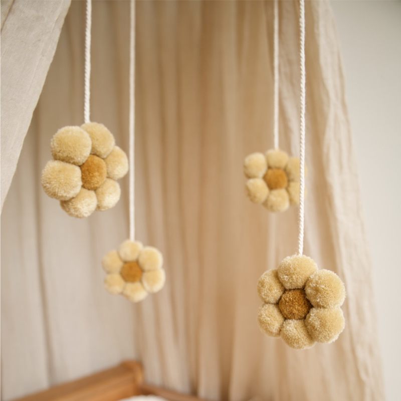 Laat je kleintje genieten van een leuke pompon mobiel door het boven het bedje te hangen! Gemaakt van katoen en hout.