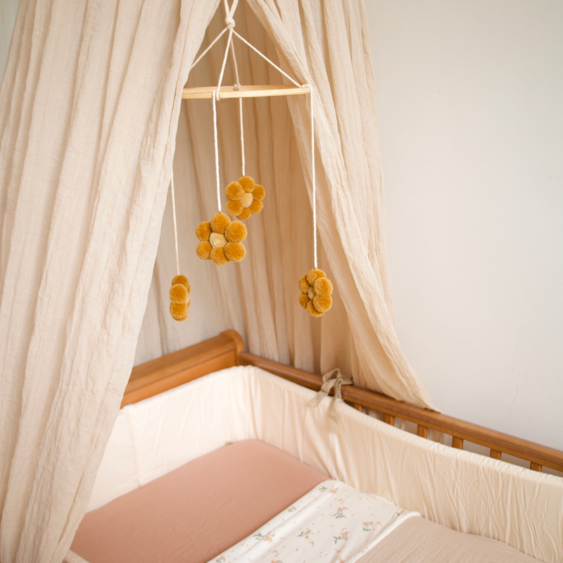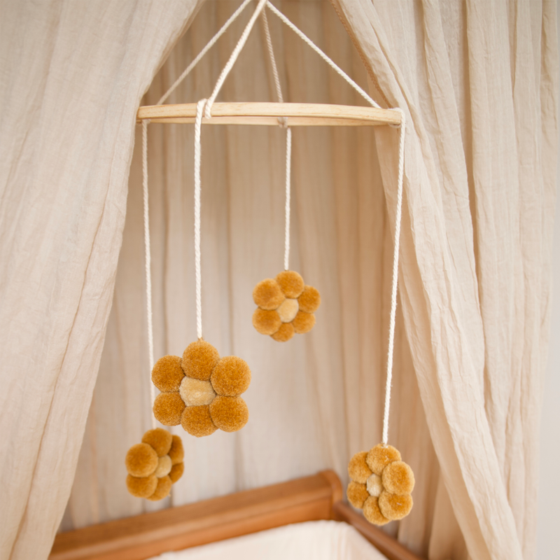 Laat je kleintje genieten van een leuke pompon mobiel door het boven het bedje te hangen! Draad en pompons zijn gemaakt van katoen en de frame van hout.