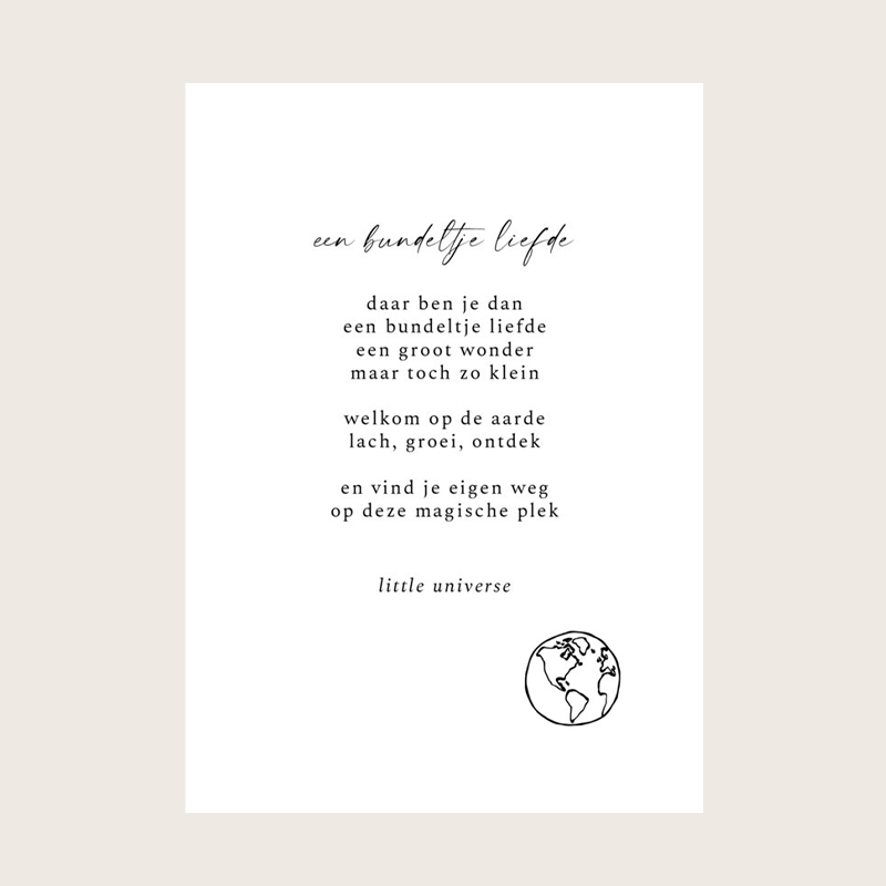 Dit prachtige gedichtje met Een bundeltje liefde is geschreven door het merk Little Universe. Leuk om in te lijsten en op de muur te hangen.
